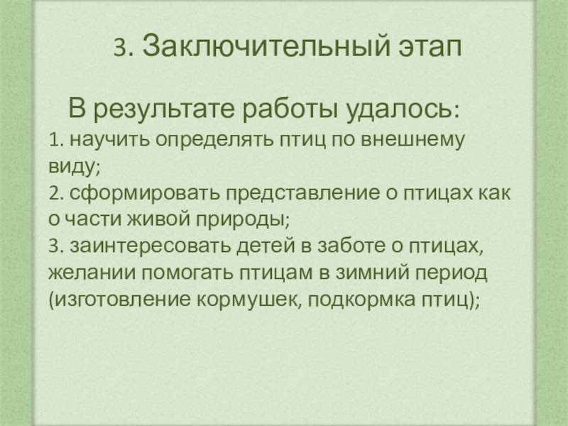 В результате работы удалось: 1. научить определять птиц по внешнему виду; 2. сформировать представление о птицах как о части живой природы; 3. заинтересовать детей в заботе о птицах, желании помогать птицам в зимний период (изготовление кормушек, подкормка птиц);