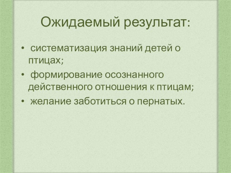 Ожидаемый результат: систематизация знаний детей о птицах; формирование осознанного действенного отношения к птицам; желание заботиться о пернатых.
