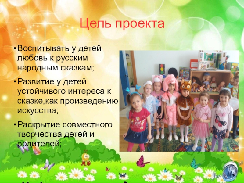 Цель проектаВоспитывать у детей любовь к русским народным сказкам; Развитие у детей устойчивого интереса к сказке,как произведению