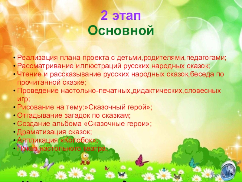 2 этап ОсновнойРеализация плана проекта с детьми,родителями,педагогами;Рассматривание иллюстраций русских народных сказок;Чтение и рассказывание русских народных сказок,беседа по
