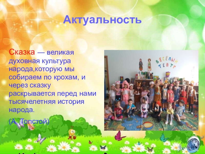 АктуальностьСказка — великая духовная культура народа,которую мы собираем по крохам, и через сказку раскрывается перед нами тысячелетняя история народа.(А. Толстой)