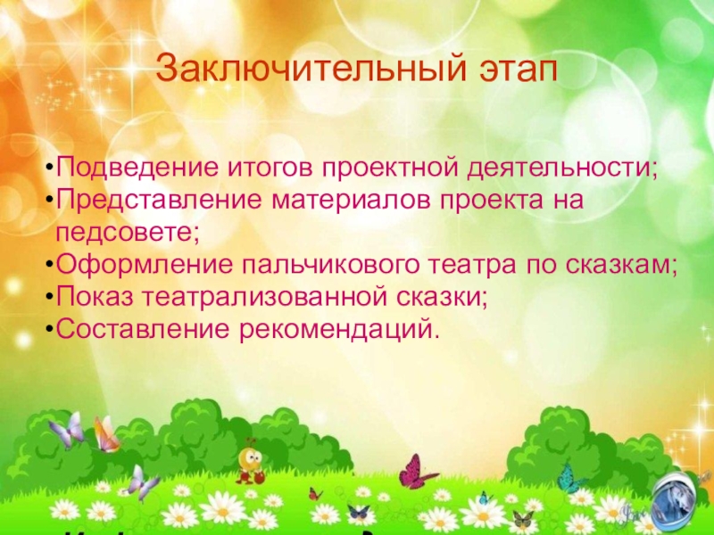 Заключительный этапПодведение итогов проектной деятельности;Представление материалов проекта на педсовете;Оформление пальчикового театра по сказкам;Показ театрализованной сказки;Составление рекомендаций.