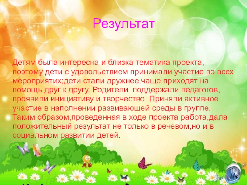 Таким образом,проведенная в ходе проекта работа,дала положительный результат не только в речевом,но и в социальном развитии детей.