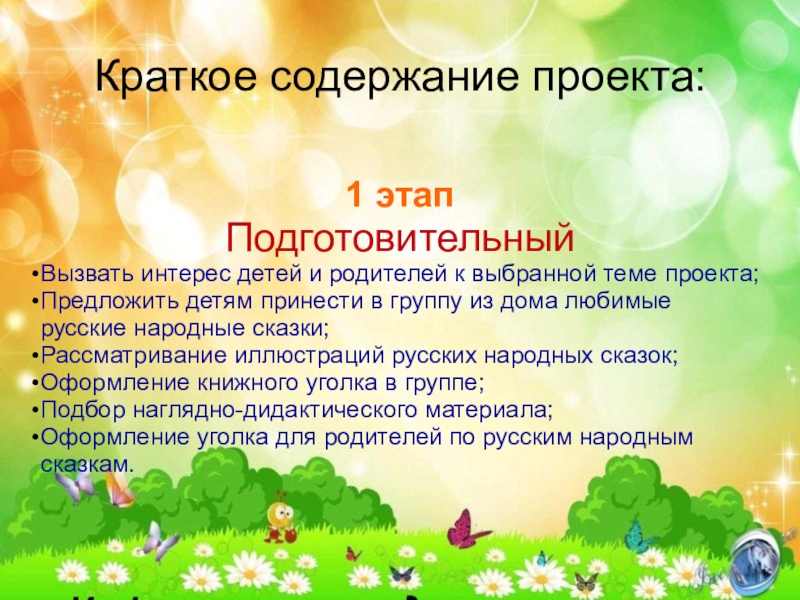 Краткое содержание проекта:1 этапПодготовительныйВызвать интерес детей и родителей к выбранной теме проекта;Предложить детям принести в группу из