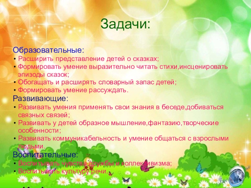 Задачи:Образовательные:Расширить представление детей о сказках;Формировать умение выразительно читать стихи,инсценировать эпизоды сказок;Обогащать и расширять словарный запас детей;Формировать умение