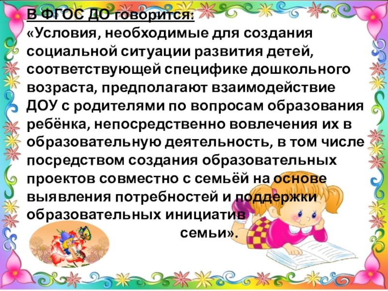 развития детей, соответствующей специфике дошкольного возраста, предполагают взаимодействие ДОУ с родителями по вопросам образования ребёнка, непосредственно вовлечения их в образовательную деятельность, в том числе посредством создания образовательных проектов совместно с семьёй на основе выявления потребностей и поддержки