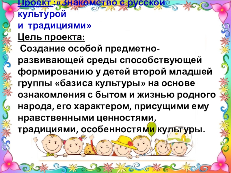 предметно-развивающей среды способствующей формированию у детей второй младшей группы «базиса культуры» на основе ознакомления с бытом и жизнью родного народа, его характером, присущими ему нравственными ценностями, традициями, особенностями культуры.