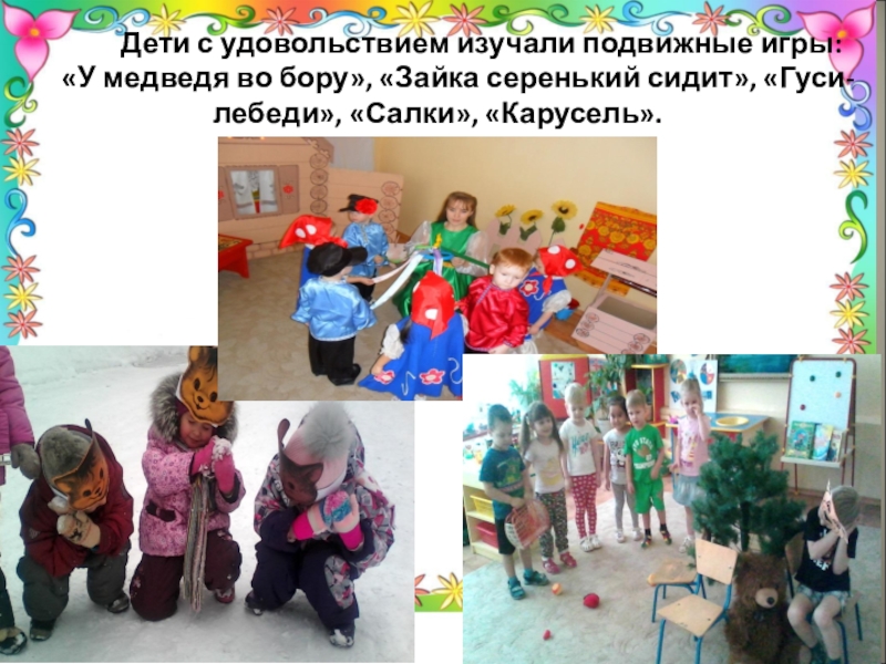 «У медведя во бору», «Зайка серенький сидит», «Гуси- лебеди», «Салки», «Карусель».