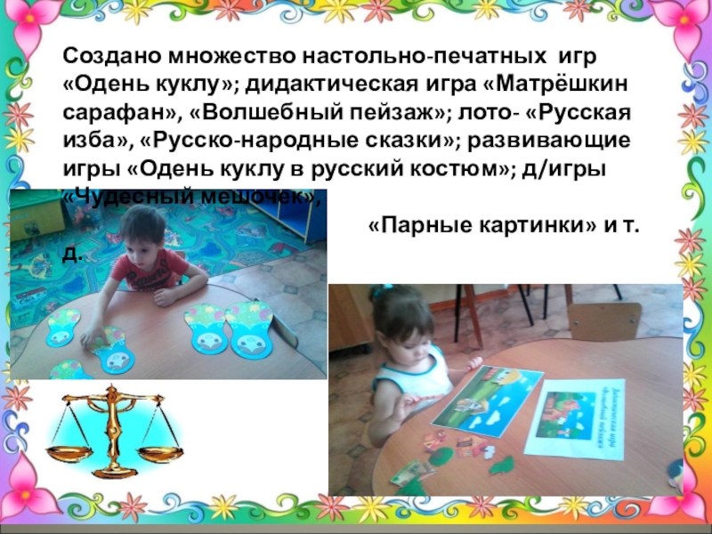 Создано множество настольно-печатных игр «Одень куклу»; дидактическая игра «Матрёшкин сарафан»,