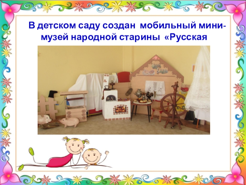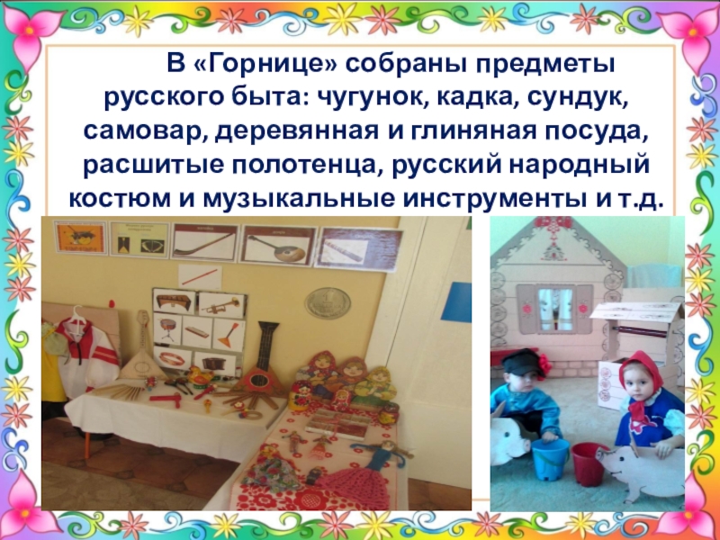 предметы русского быта: чугунок, кадка, сундук, самовар, деревянная и глиняная посуда, расшитые полотенца, русский народный костюм и музыкальные инструменты и т.д.