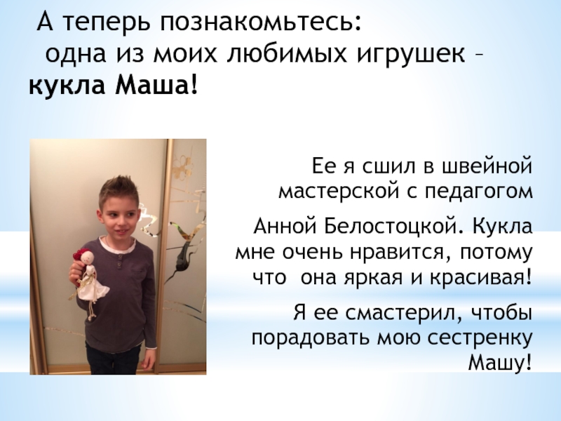 Анной Белостоцкой. Кукла мне очень нравится, потому что она яркая и красивая!
