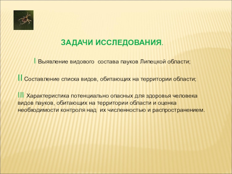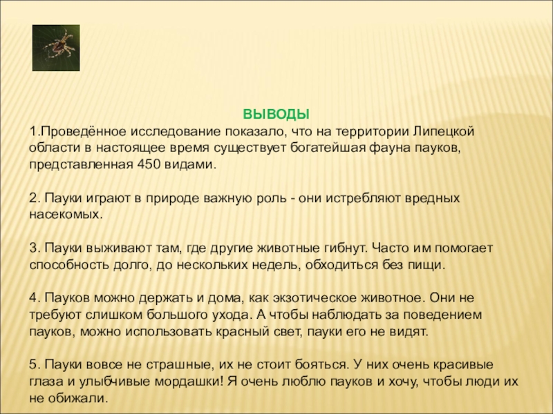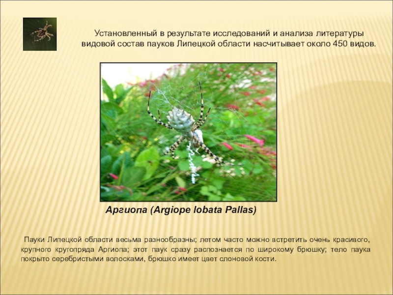 Пауки Липецкой области весьма разнообразны; летом часто можно встретить очень красивого, крупного кругопряда Аргиопа; этот паук сразу распознается по широкому брюшку; тело паука покрыто серебристыми волосками, брюшко имеет цвет слоновой кости.