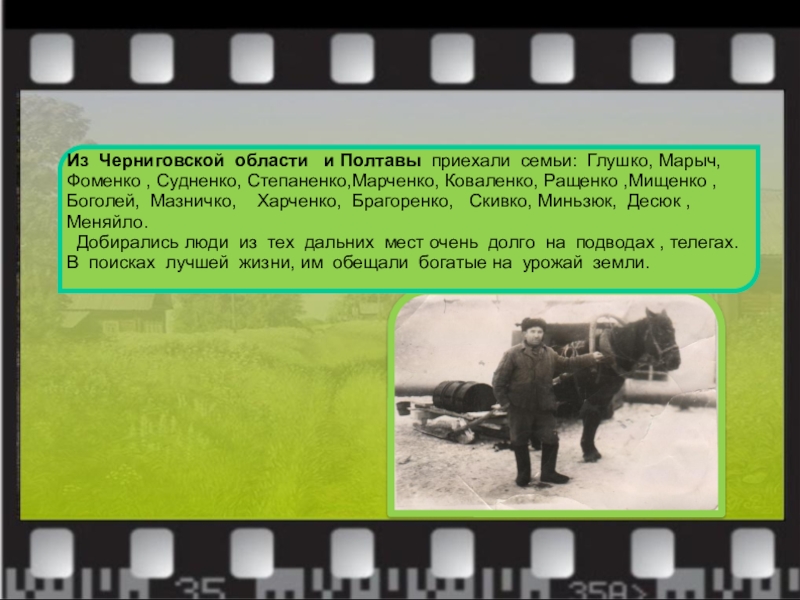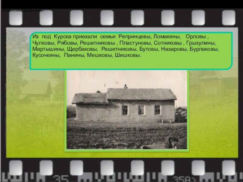 Из под Курска приехали семьи Репринцевы, Ломакины, Орловы , Чулковы, Рябовы, Решетниковы , Пластуновы, Сотниковы , Грызулины, Мартышины, Щербаковы, Решетниковы, Бутовы, Назаровы, Бурлаковы, Кусочкины, Панины, Мешковы, Шишковы.