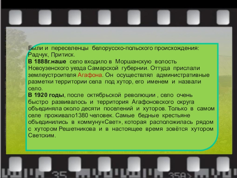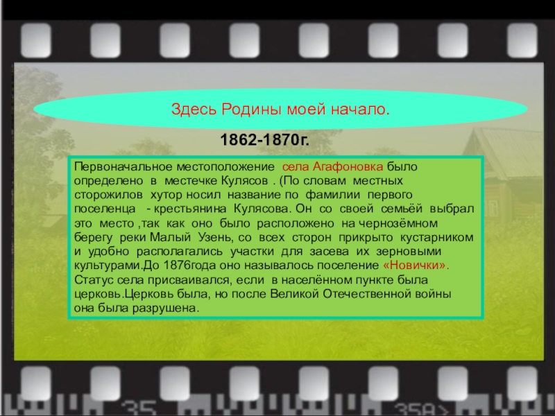 Первоначальное местоположение села Агафоновка было определено в местечке Кулясов . (По словам местных сторожилов хутор носил название по фамилии первого поселенца - крестьянина Кулясова. Он со своей семьёй выбрал это место ,так как оно было расположено на чернозёмном берегу реки Малый Узень, со всех сторон прикрыто кустарником и удобно располагались участки для засева их зерновыми культурами.До 1876года оно называлось поселение «Новички».Статус села присваивался, если в населённом пункте была церковь.Церковь была, но после Великой Отечественной войны она была разрушена.