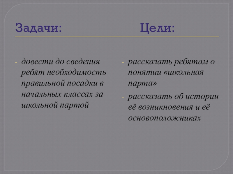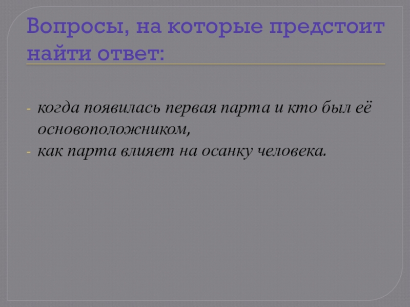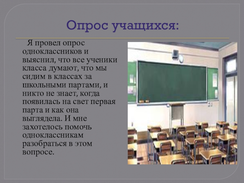 что все ученики класса думают, что мы сидим в классах за школьными партами, и никто не знает, когда появилась на свет первая парта и как она выглядела. И мне захотелось помочь одноклассникам разобраться в этом вопросе.