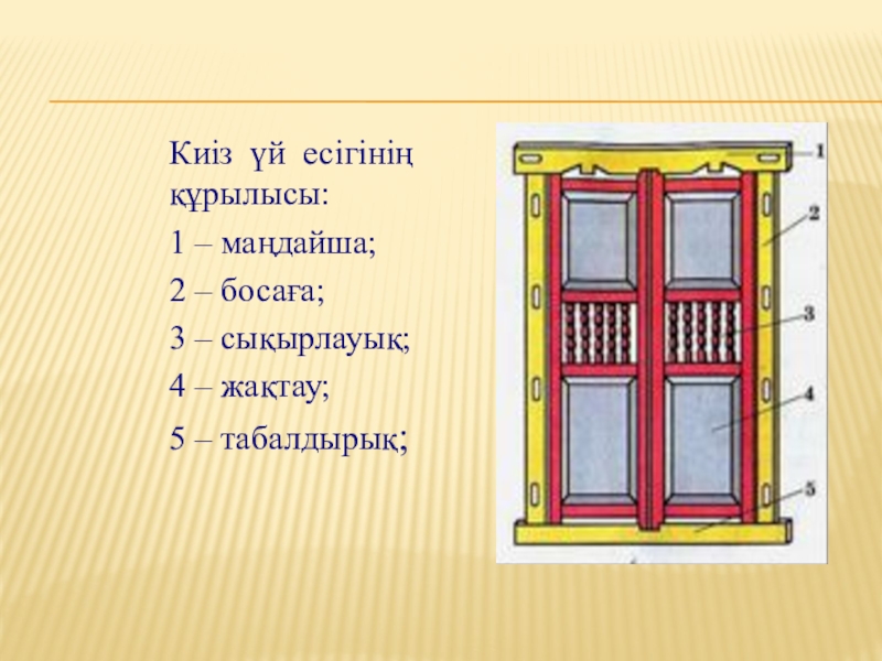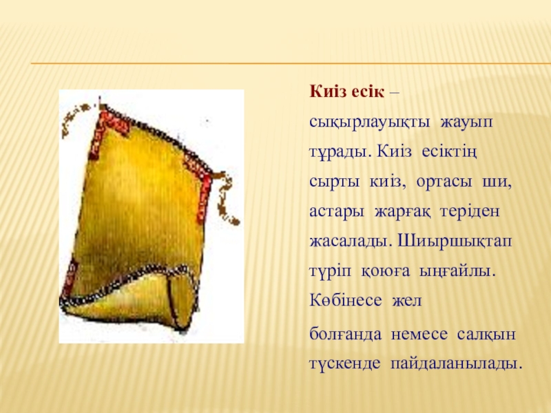 Слайд 14Киіз есік – сықырлауықты жауып тұрады. Киіз есіктің сырты киіз, ортасы