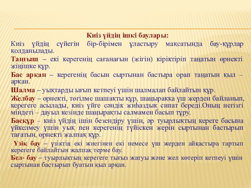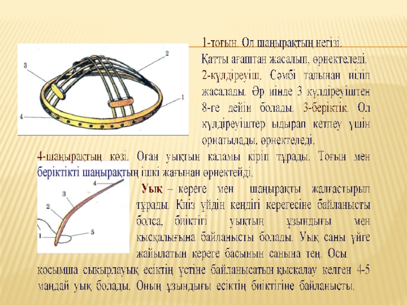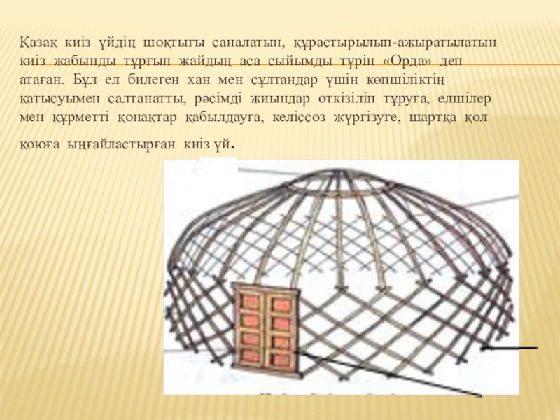 Слайд 4Қазақ киіз үйдің шоқтығы саналатын, құрастырылып-ажыратылатын киіз жабынды тұрғын жайдың аса
