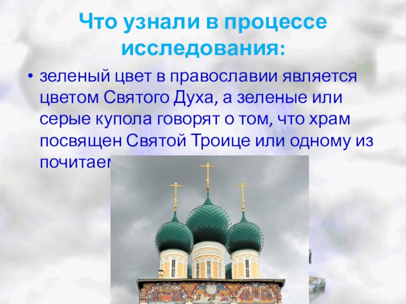 Духа, а зеленые или серые купола говорят о том, что храм посвящен Святой Троице или одному из почитаемых святых