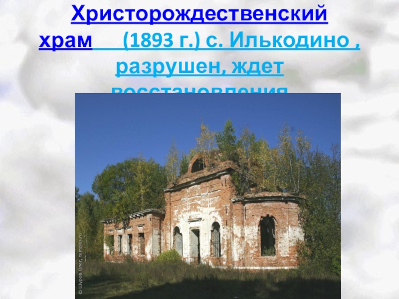 Слайд 27Христорождественский храм (1893 г.) с. Илькодино , разрушен, ждет восстановления