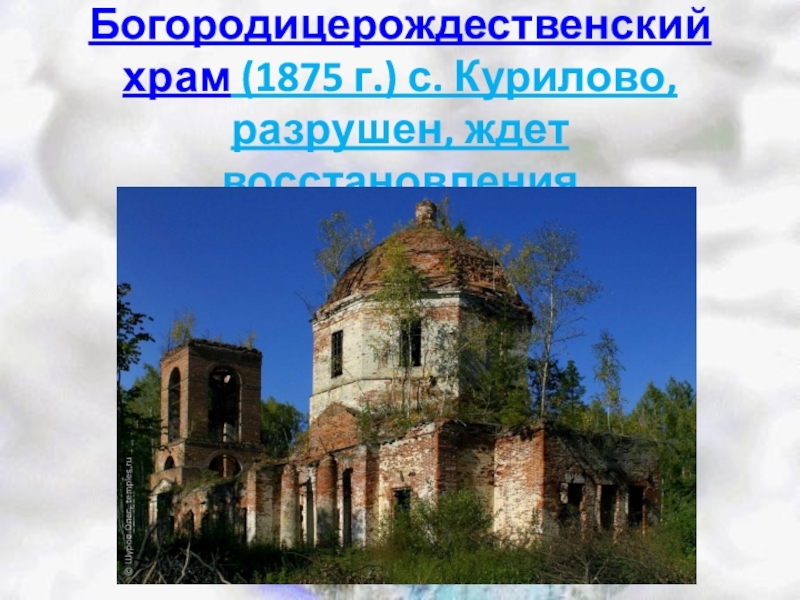 Слайд 28Богородицерождественский храм (1875 г.) с. Курилово, разрушен, ждет восстановления