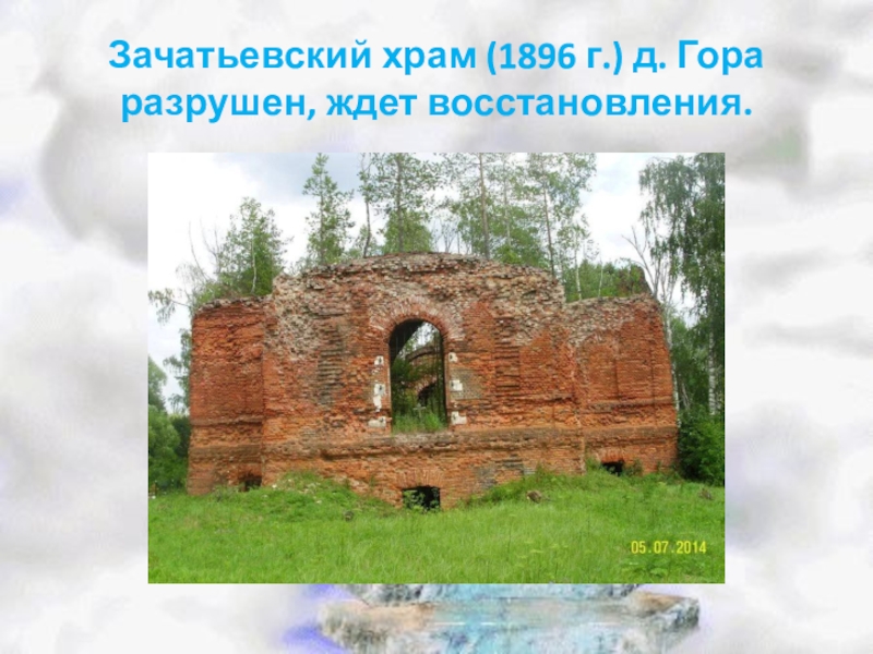 Слайд 24Зачатьевский храм (1896 г.) д. Гора разрушен, ждет восстановления.