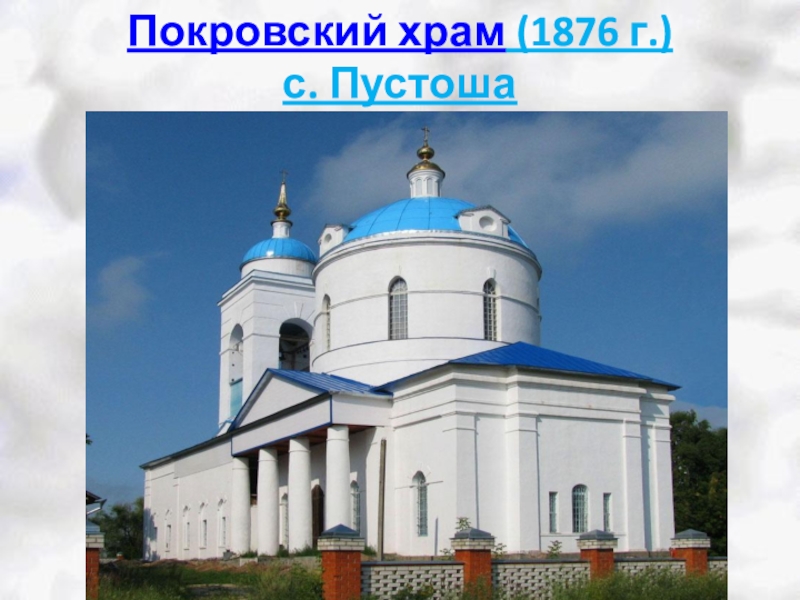 Слайд 30Покровский храм (1876 г.) с. Пустоша