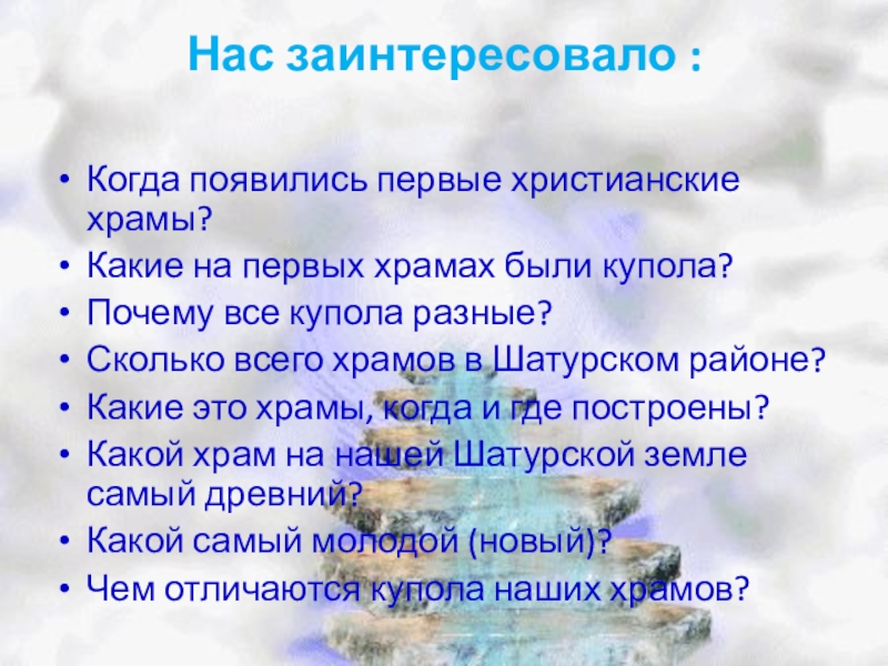 1. Изучить материал об архитектурных особенностях куполов храмов в Шатурском районе ;