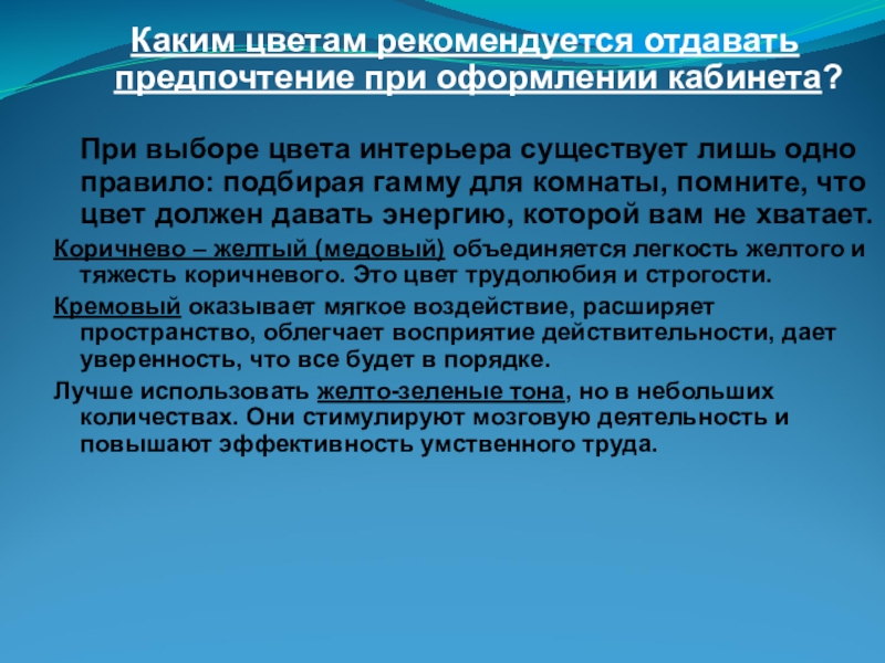 Слайд 16Каким цветам рекомендуется отдавать предпочтение при оформлении кабинета?