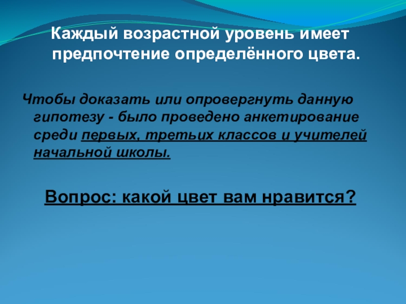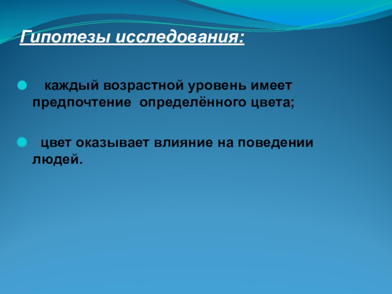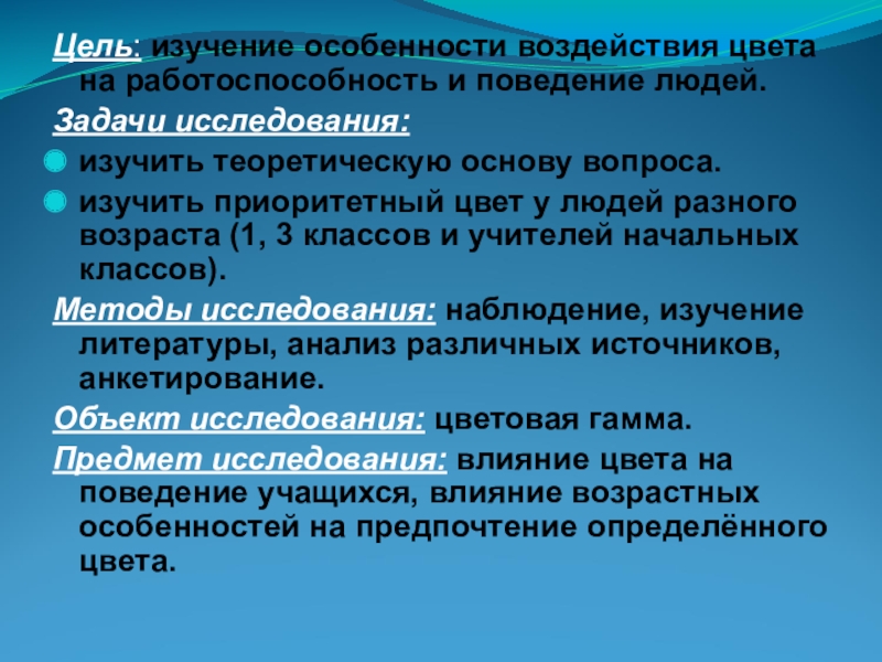Предмет исследования: влияние цвета на поведение учащихся, влияние возрастных особенностей на предпочтение определённого цвета.