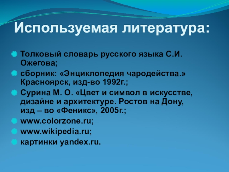 М. О. «Цвет и символ в искусстве, дизайне и архитектуре. Ростов на Дону, изд – во «Феникс», 2005г.;