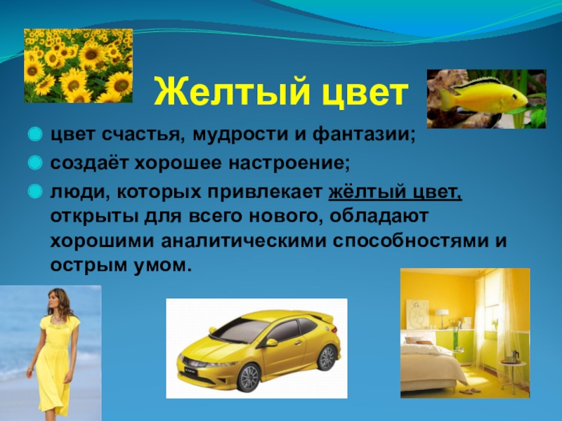 люди, которых привлекает жёлтый цвет, открыты для всего нового, обладают хорошими аналитическими способностями и острым умом.