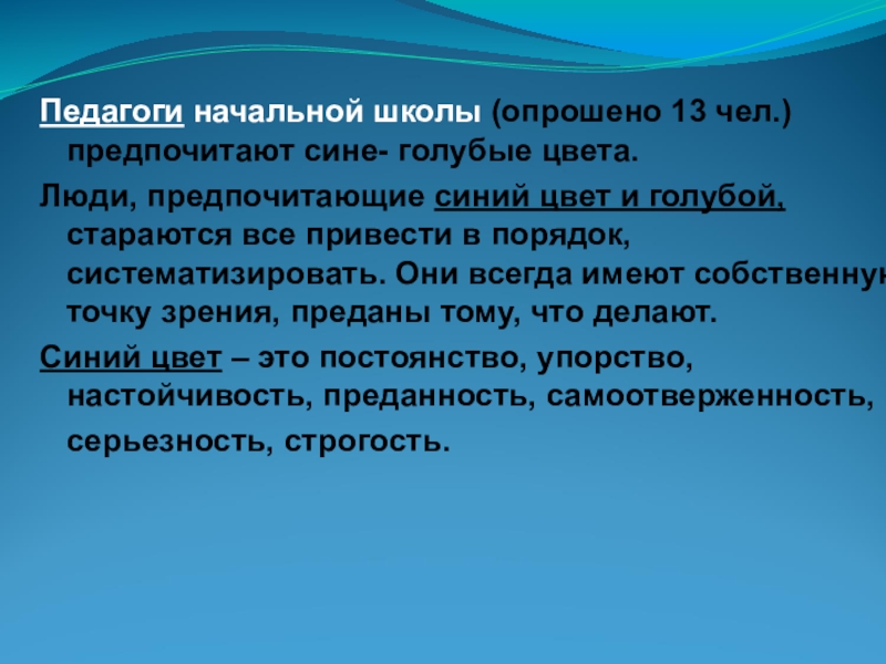 Слайд 15Педагоги начальной школы (опрошено 13 чел.) предпочитают сине- голубые цвета.