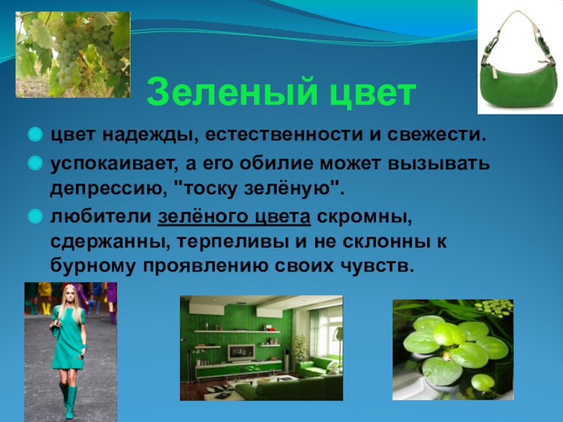 любители зелёного цвета скромны, сдержанны, терпеливы и не склонны к бурному проявлению своих чувств.