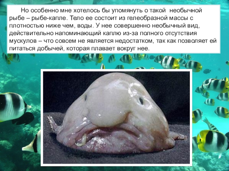 рыбе-капле. Тело ее состоит из гелеобразной массы с плотностью ниже чем, воды. У нее совершенно необычный вид, действительно напоминающий каплю из-за полного отсутствия мускулов – что совсем не является недостатком, так как позволяет ей питаться добычей, которая плавает вокруг нее.
