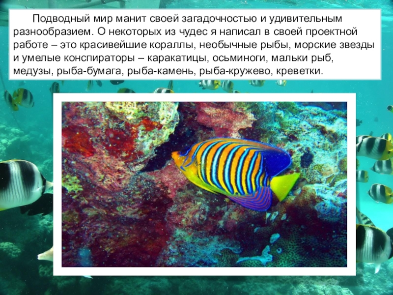 Слайд 4Подводный мир манит своей загадочностью и удивительным разнообразием. О некоторых из