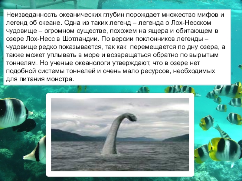Слайд 7Неизведанность океанических глубин порождает множество мифов и легенд об океане. Одна