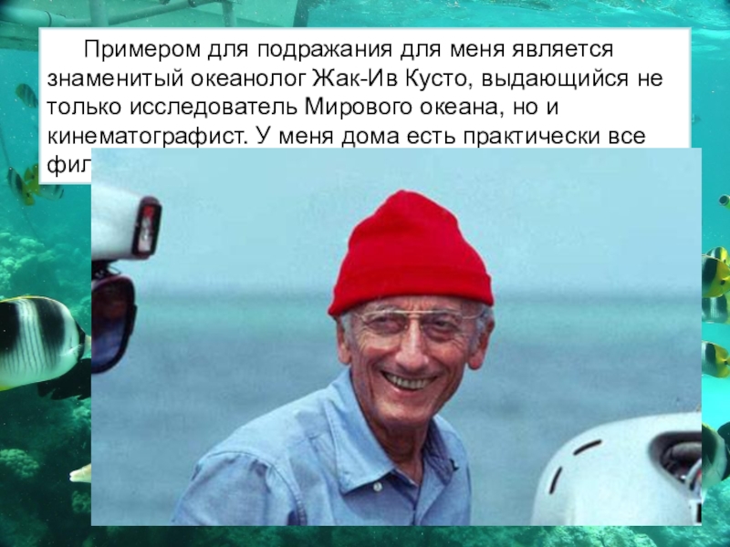 Слайд 3Примером для подражания для меня является знаменитый океанолог Жак-Ив Кусто, выдающийся
