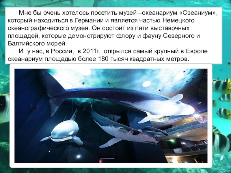 Слайд 6Мне бы очень хотелось посетить музей –океанариум «Озеаниум», который находиться в