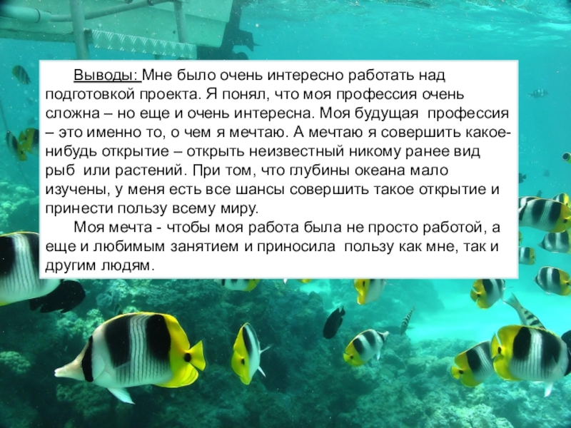 что моя профессия очень сложна – но еще и очень интересна. Моя будущая профессия – это именно то, о чем я мечтаю. А мечтаю я совершить какое-нибудь открытие – открыть неизвестный никому ранее вид рыб или растений. При том, что глубины океана мало изучены, у меня есть все шансы совершить такое открытие и принести пользу всему миру.