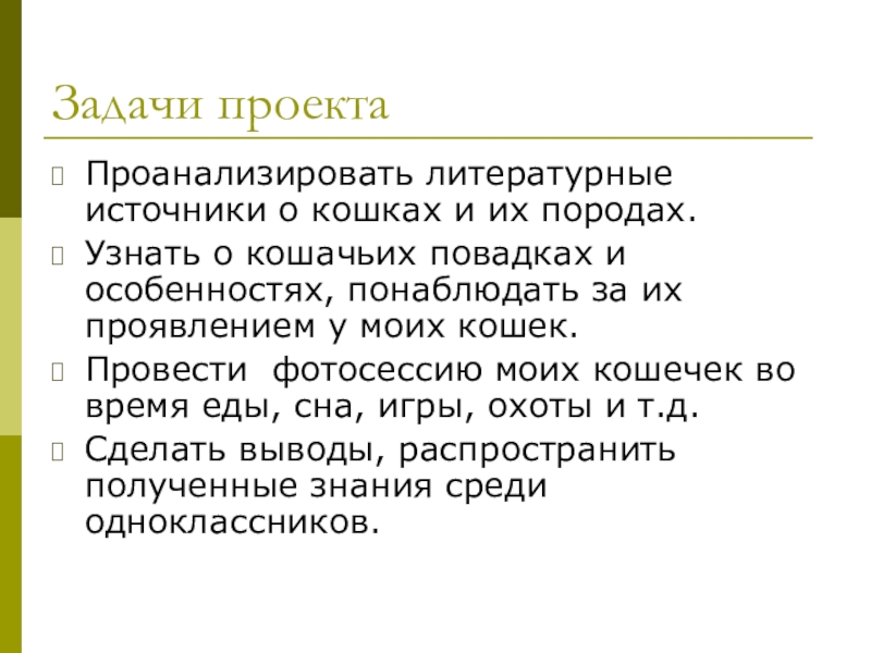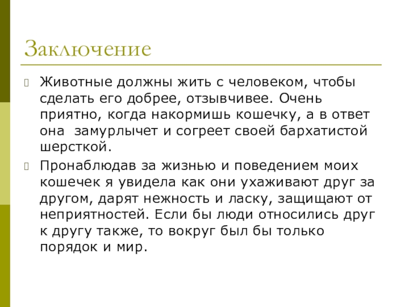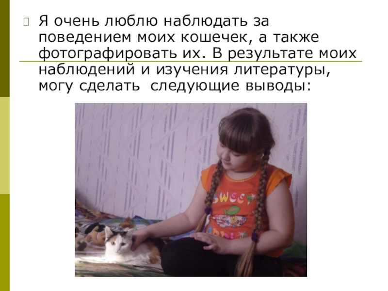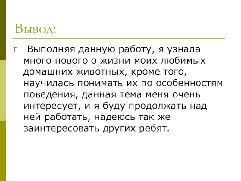 любимых домашних животных, кроме того, научилась понимать их по особенностям поведения, данная тема меня очень интересует, и я буду продолжать над ней работать, надеюсь так же заинтересовать других ребят.