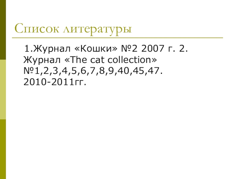 1.Журнал «Кошки» №2 2007 г. 2.Журнал «The cat