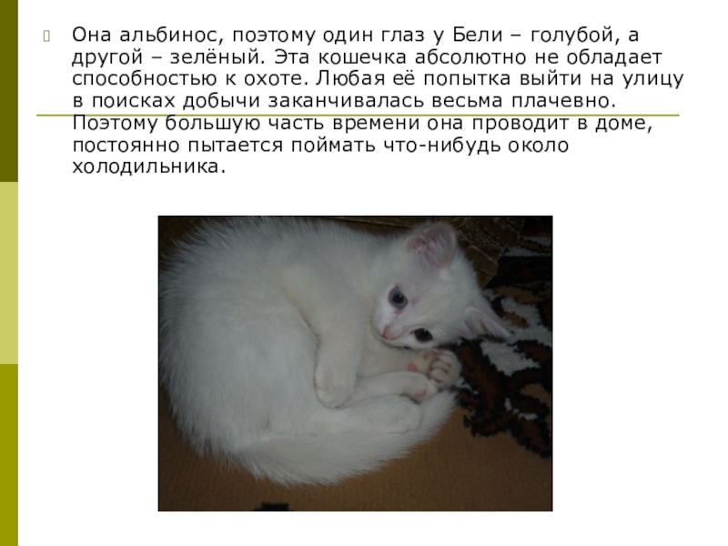 – зелёный. Эта кошечка абсолютно не обладает способностью к охоте. Любая её попытка выйти на улицу в поисках добычи заканчивалась весьма плачевно. Поэтому большую часть времени она проводит в доме, постоянно пытается поймать что-нибудь около холодильника.