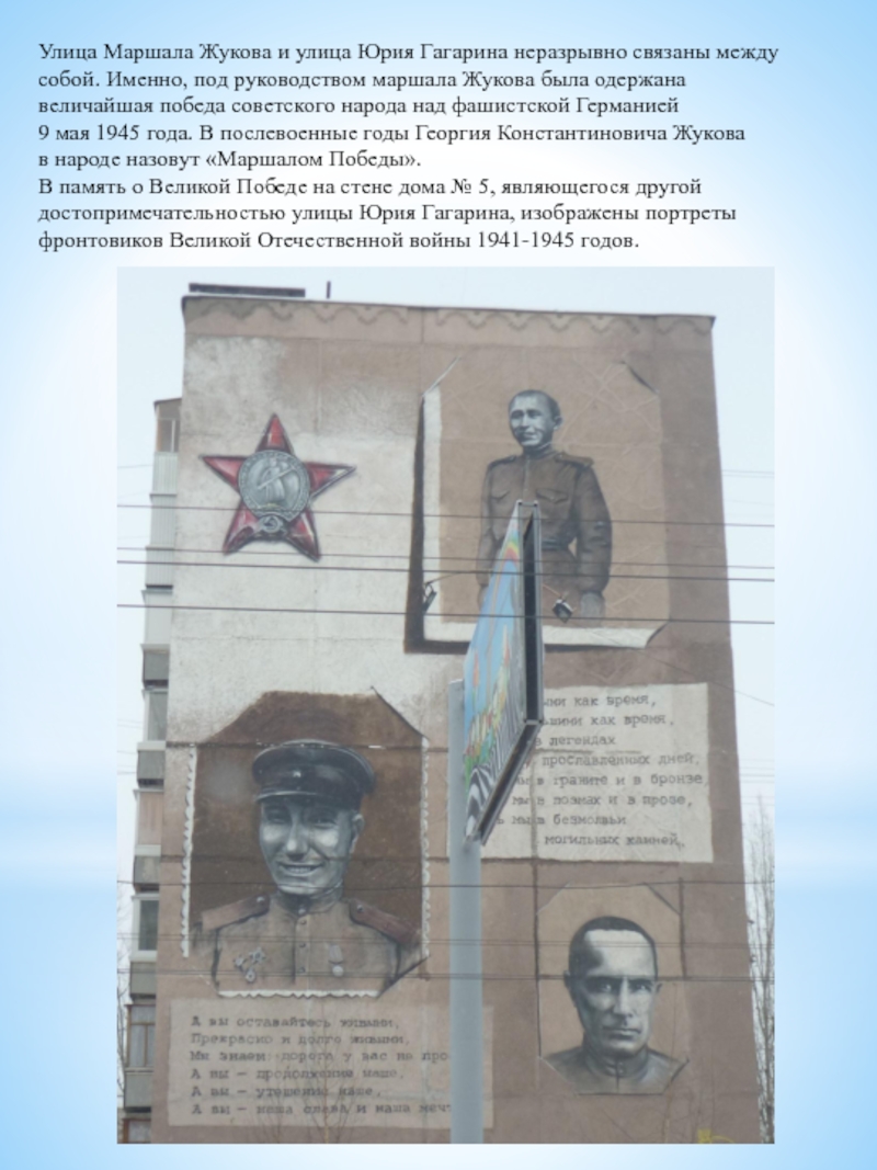 Слайд 9Улица Маршала Жукова и улица Юрия Гагарина неразрывно связаны между