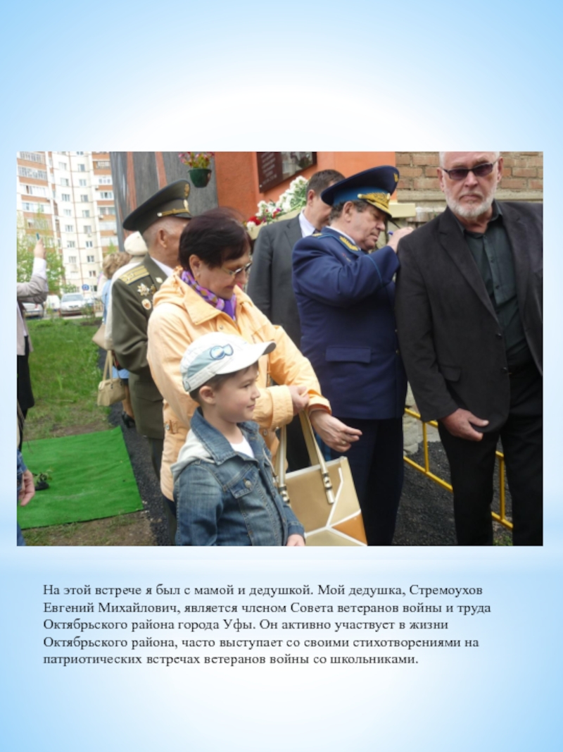 Слайд 6На этой встрече я был с мамой и дедушкой. Мой дедушка,