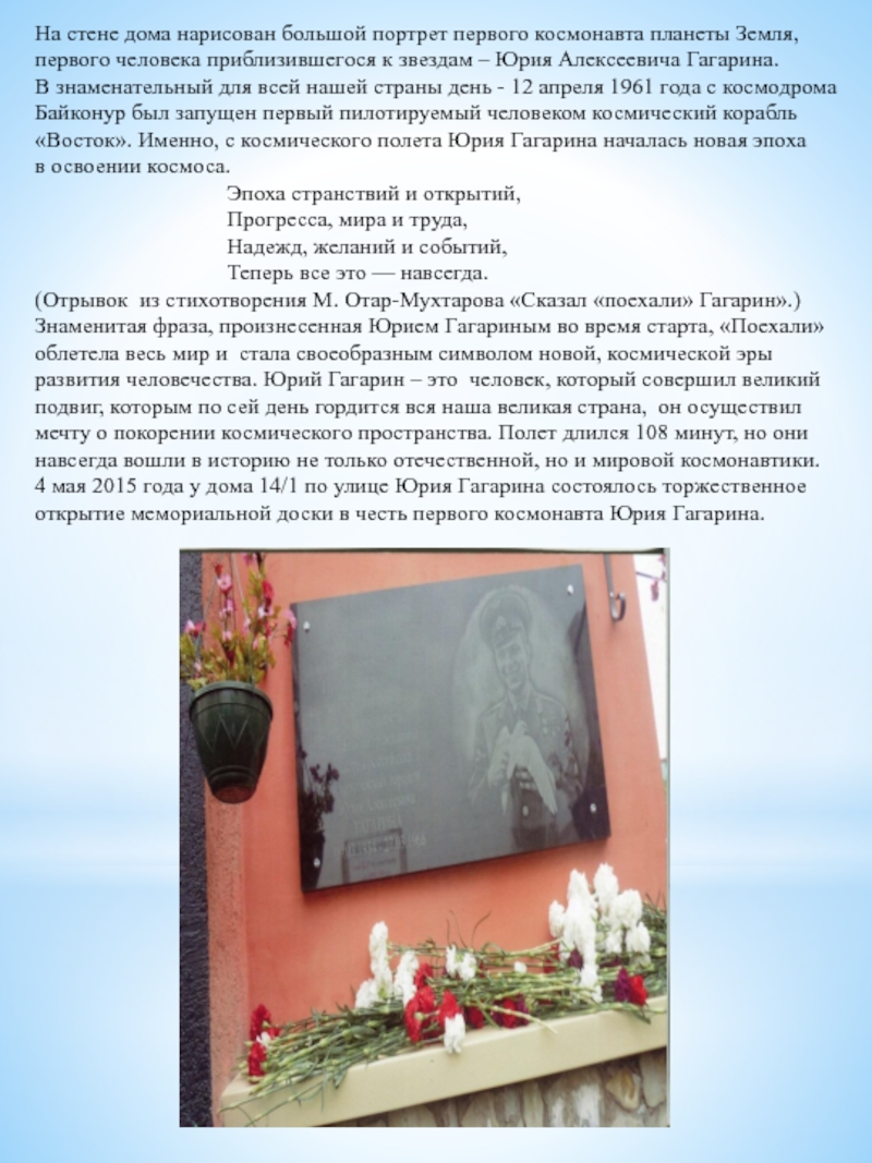 Слайд 3На стене дома нарисован большой портрет первого космонавта планеты Земля,