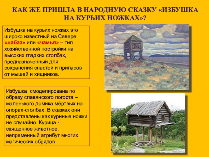Избушка смоделирована по образу славянского погоста – маленького домика мёртвых на опорах-столбах. В сказках они представлены как куриные ножки не случайно. Курица - священное животное, непременный атрибут многих магических обрядов.