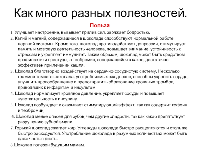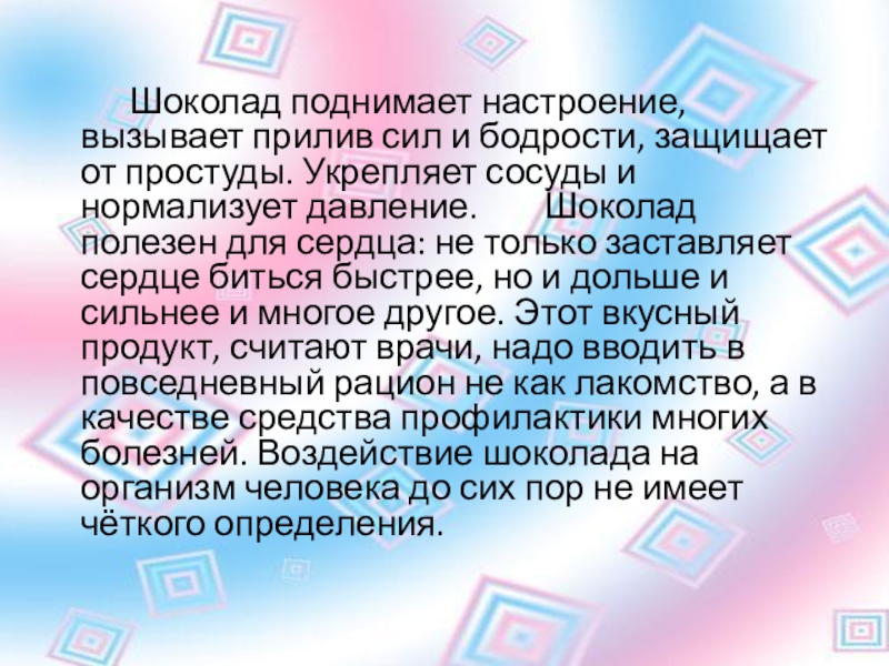 и бодрости, защищает от простуды. Укрепляет сосуды и нормализует давление. Шоколад полезен для сердца: не только заставляет сердце биться быстрее, но и дольше и сильнее и многое другое. Этот вкусный продукт, считают врачи, надо вводить в повседневный рацион не как лакомство, а в качестве средства профилактики многих болезней. Воздействие шоколада на организм человека до сих пор не имеет чёткого определения.