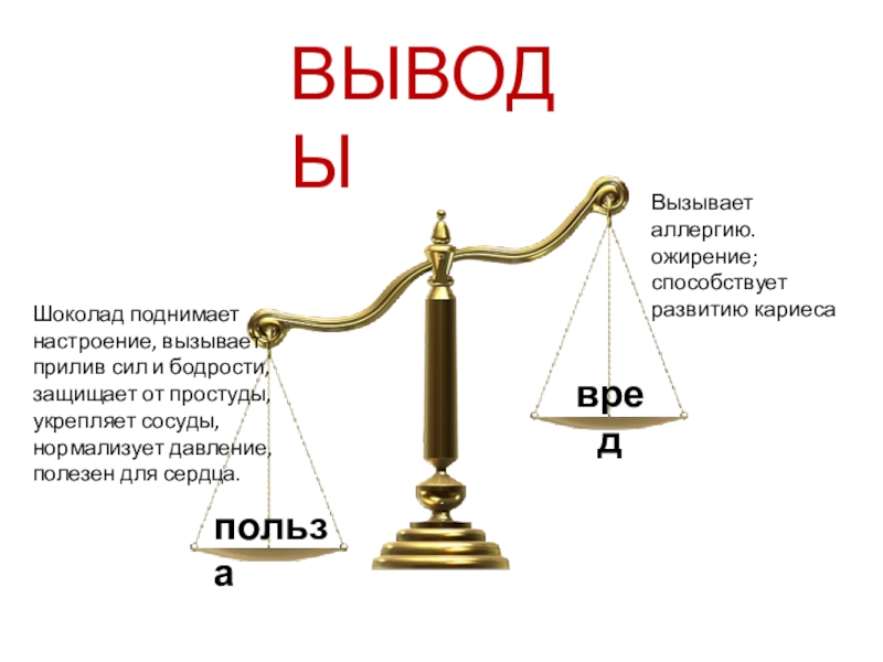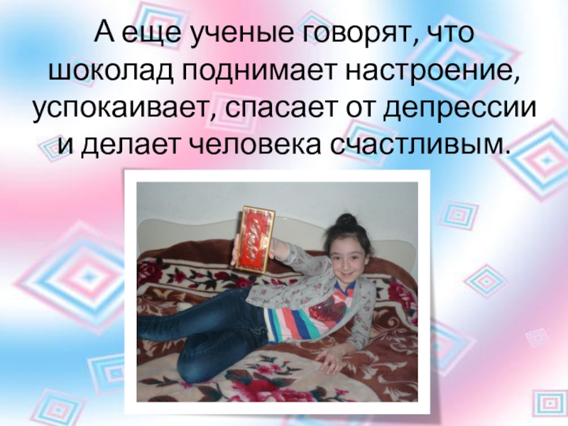 Слайд 24А еще ученые говорят, что шоколад поднимает настроение, успокаивает, спасает от