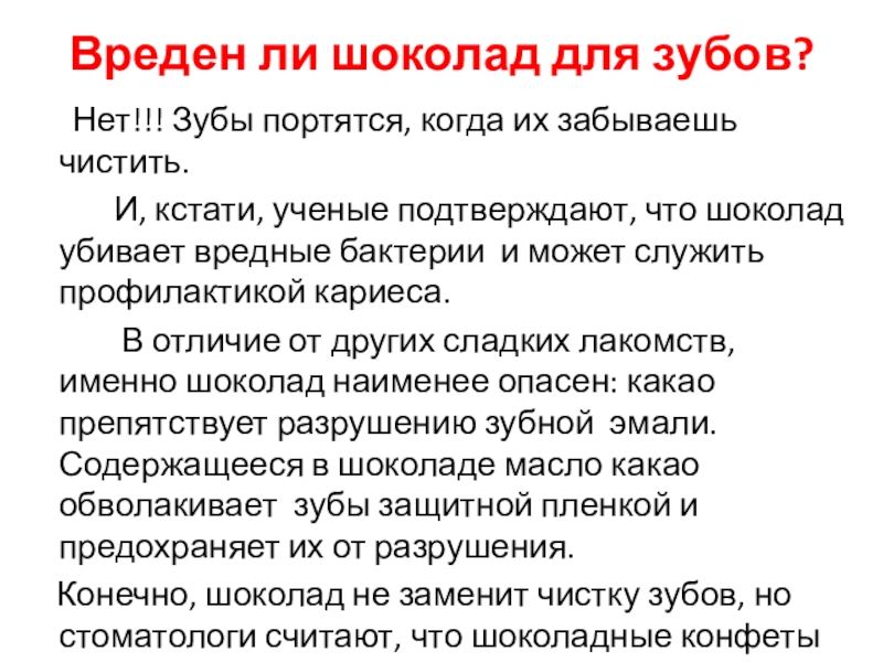 Конечно, шоколад не заменит чистку зубов, но стоматологи считают, что шоколадные конфеты менее вредны, чем карамель.