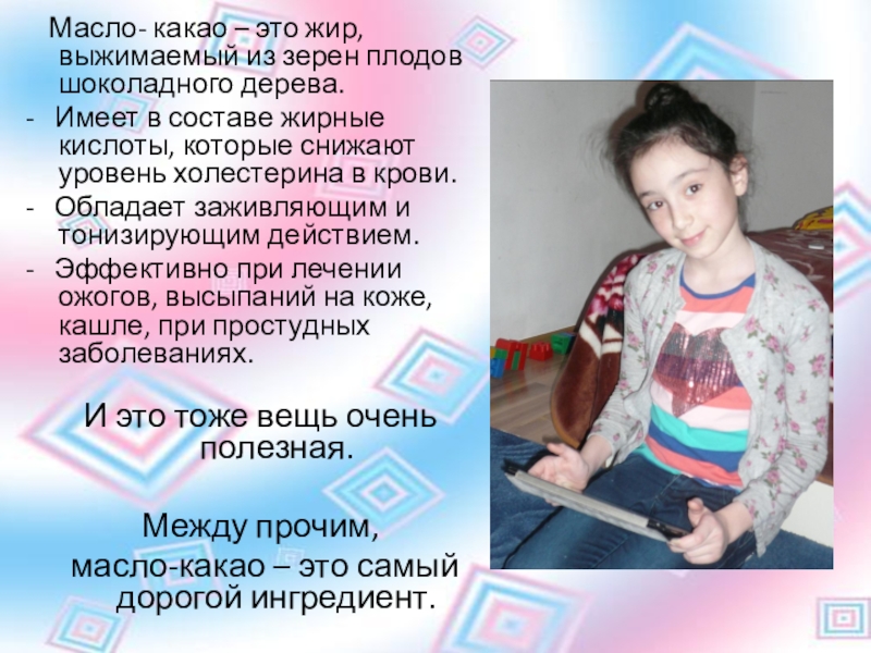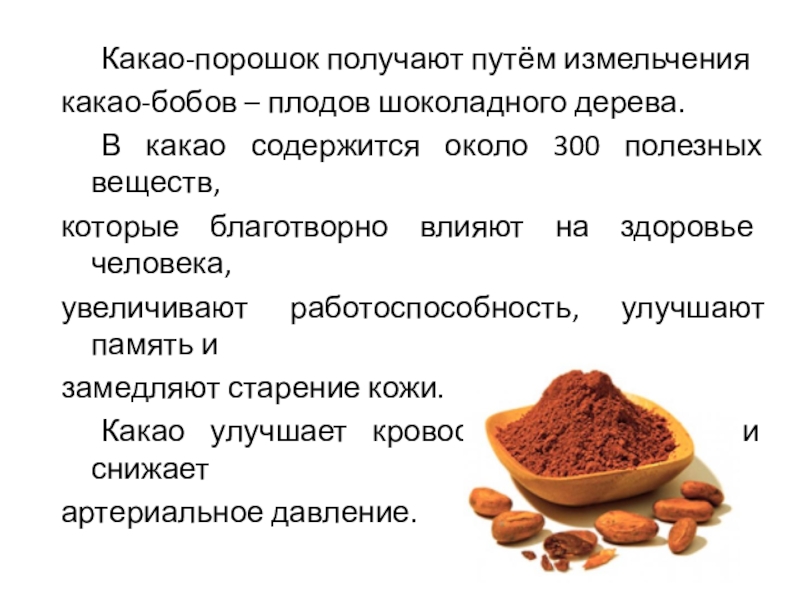 Слайд 14 Масло- какао – это жир, выжимаемый из зерен плодов